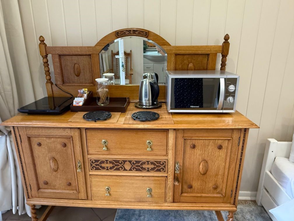 - Double room, en-suite shower, basin, toilet + small open plan living area with a single sleeper couch and an extra roll out mattress on request